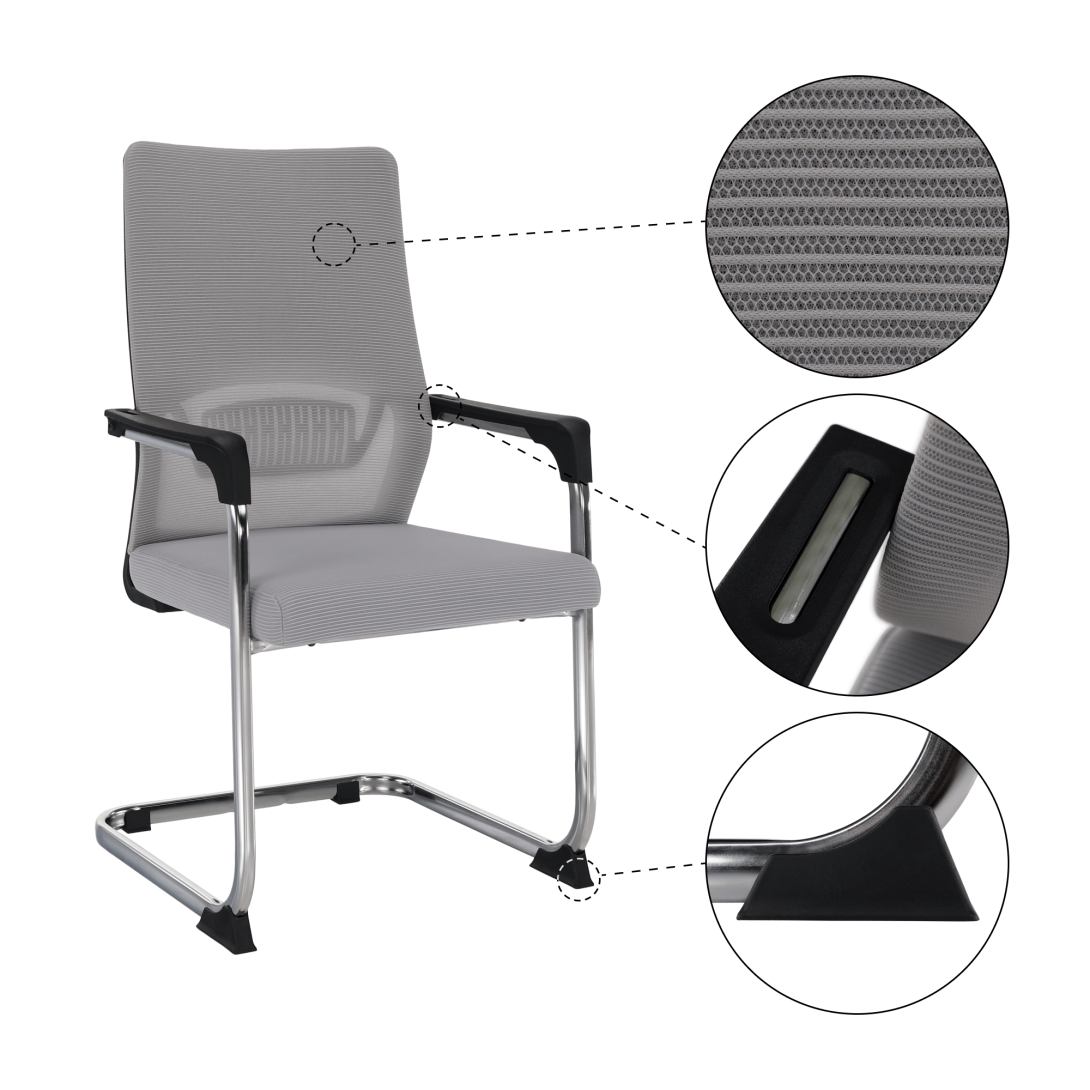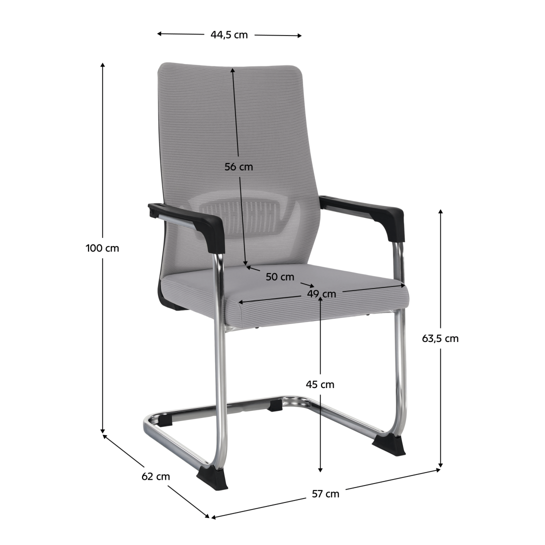 Materiál čalúnenie: sieťovina/plast/kovOderuodolnosť textílie podľa testu Martindale: 90 000 oderovFarba: sivá/čiernaMateriál konštrukcia: kovFarba: chrómová povrchová úpravaRozmery (ŠxHxV): 57x62x100 cmVýška sedu: 45 cmHĺbka sedu: 50 cmŠírka sedu : 49 cmVýška chrbtovej opierky: 56 cmŠírka chrbtovej opierky: 44,5 cmVýška od zeme po opierku na ruky: 63,5 cmNosnosť: 110 kgChrómová podstavaPlastové opierky na rukyDodávané v demonte