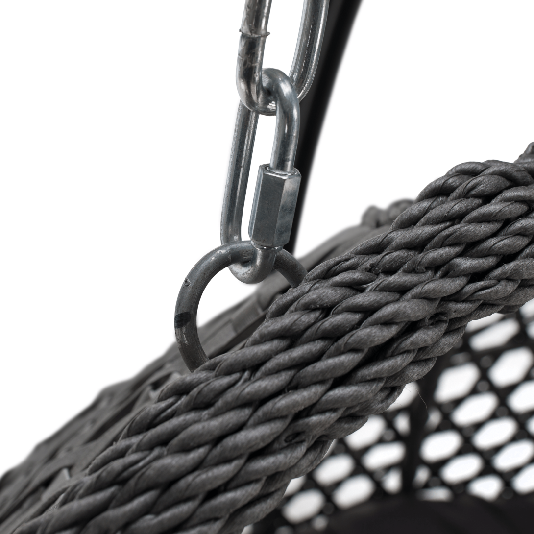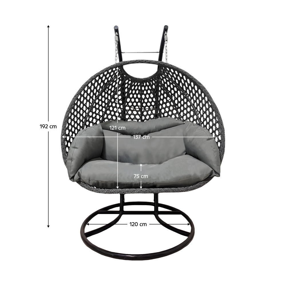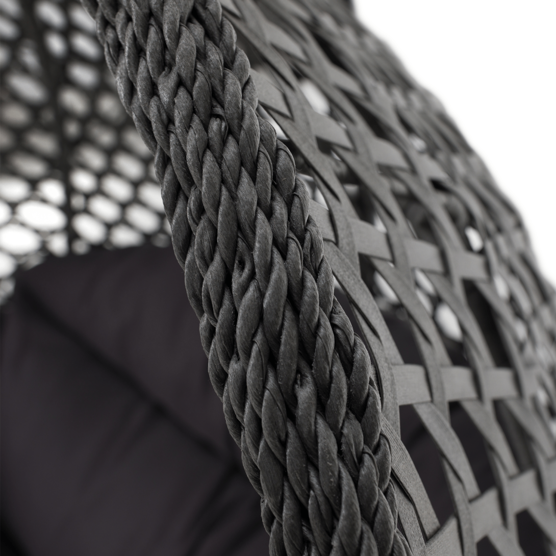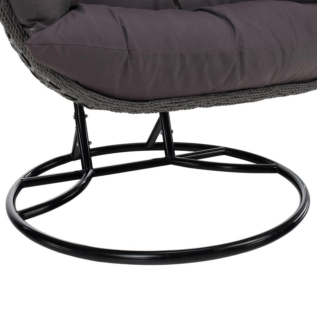 Materiál konštrukcia: oceľFarba: čiernaMateriál kreslo: umelý ratanFarba: siváMateriál vankúše: látkaFarba: tmavosiváOderuodolnosť textílie podľa testu Martindale: 95 000 oderovRozmery (ŠxHxV): 137x120x192 cmRozmery stojan (ŠxHxV): 120x120x192 cmRozmery kreslo (ŠxHxV): 137x75x121 cmMaximálna nosnosť: do 200 kgV exteriéri doporučujeme zabezpečiť kreslo ochranným krytom alebo plachtouDodávané so stojanomDodávané s vankúšmiDodávané v demonte