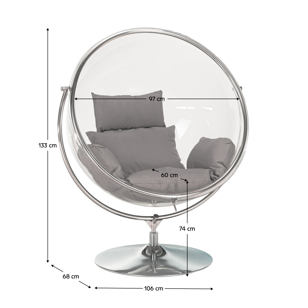 Materiál: nehrdzavejúca oceľ/ akryl/látkaOderuodolnosť textílie podľa testu Martindale: 95 000 oderovFarba rámu: striebornáFarba akrylu: transparentnáFarba vankúša: siváRozmery kresla (ŠxHxV): 106x68x133 cmVnútorný priemer: 97 cmHĺbka sedenia: 60 cmVýška sedu: 74 cm Maximálna nosnosť: do 100 kgVhodné do interiéru aj exteriéruKreslo je hojdacie aj otočnéDodávané s vankúšomVankúše sú vodeodolnéSo zipsom na spodnej strane vankúšovKreslo je dodávané so stojanomDodávané v demonte