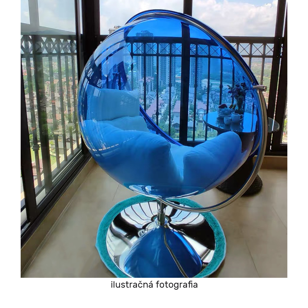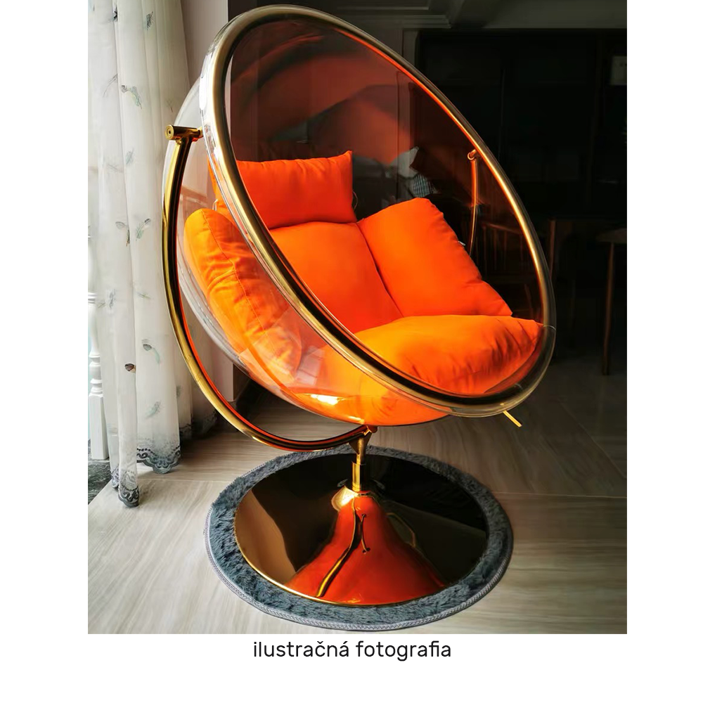 Závesné kreslo so stojanom BUBBLE NEW TYP 2Materiál: nehrdzavejúca oceľ/ akryl/látkaOderuodolnosť textílie podľa testu Martindale: 95 000 oderovFarba rámu: zlatáFarba akrylu: transparentnáFarba vankúša: siváRozmery kresla (ŠxHxV): 106x68x133 cmVnútorný priemer: 97 cmHĺbka sedenia: 60 cmVýška sedu: 74 cm Maximálna nosnosť: do 100 kgVhodné do interiéru aj exteriéruKreslo je hojdacie aj otočnéDodávané s vankúšomVankúše sú vodeodolnéSo zipsom na spodnej strane vankúšovKreslo je dodávané so stojanomDodávané v demonte