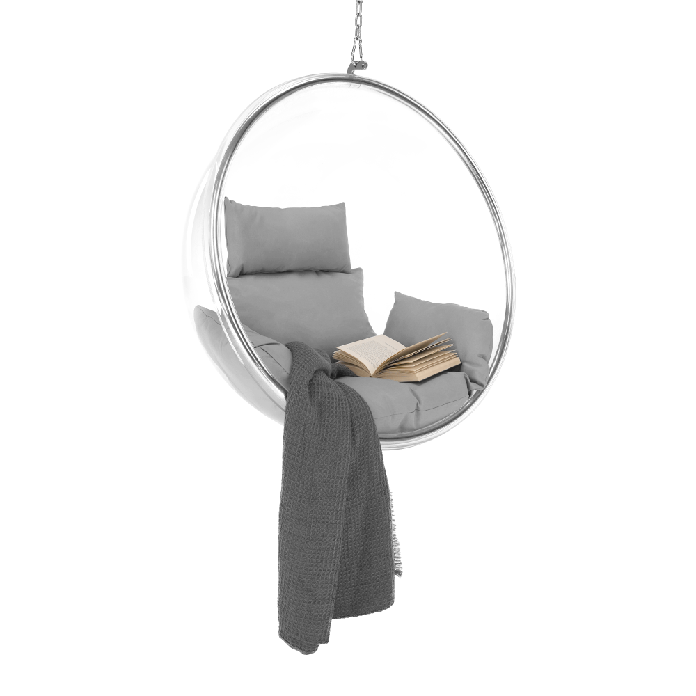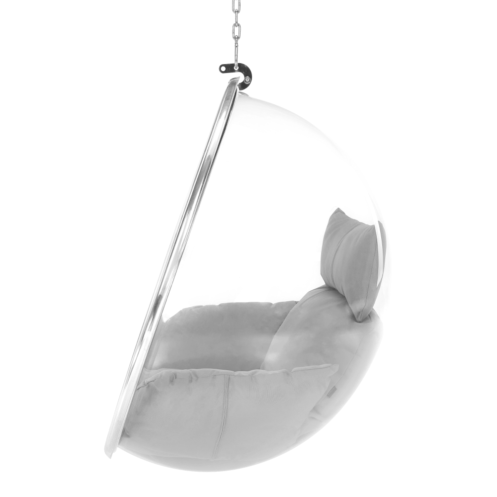 Závesné kreslo BUBBLE NEW TYP 1Materiál: nehrdzavejúca oceľ/ akryl/látkaOderuodolnosť textílie podľa testu Martindale: 95 000 oderovFarba rámu: striebornáFarba akrylu: transparentnáFarba vankúša: siváRozmery kresla (ŠxHxV): 106x62x106 cmVnútorný priemer: 97 cmHĺbka sedenia: 60 cmDĺžka retiazky: 200 cmMaximálna nosnosť: do 100 kgVhodné do interiéru aj exteriéruDodávané s vankúšomVankúše sú vodeodolnéSo zipsom na spodnej strane vankúšaDodávané v monte