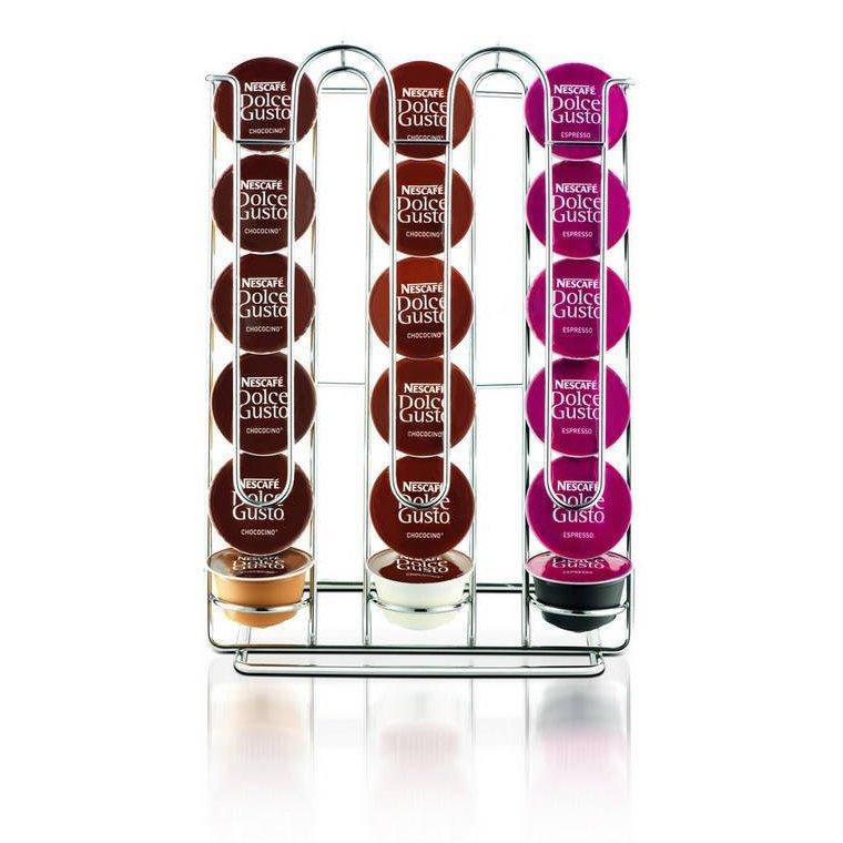 Nerezový držiak na kapsule Nescafé Dolce Gusto, možnosť umiestnenia v priestore aj zavesenie na stenu, kapacita 18 kapslí, usporiadanie kapsúl v 3 stĺpcoch
