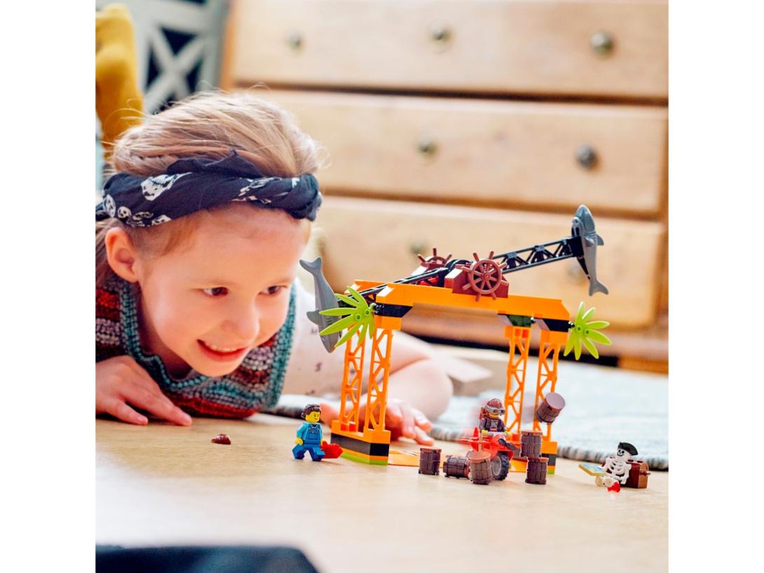 - Výzva LEGO® City Stuntz so zábavnými funkciami – Deti aktivujú hračkársky kaskadérsky bicykel a pustia ho, vyhýbajúc sa otáčajúcemu sa kolesu žralokov, aby narazili na sudy a odhalili pirátsku truhlicu s pokladom.