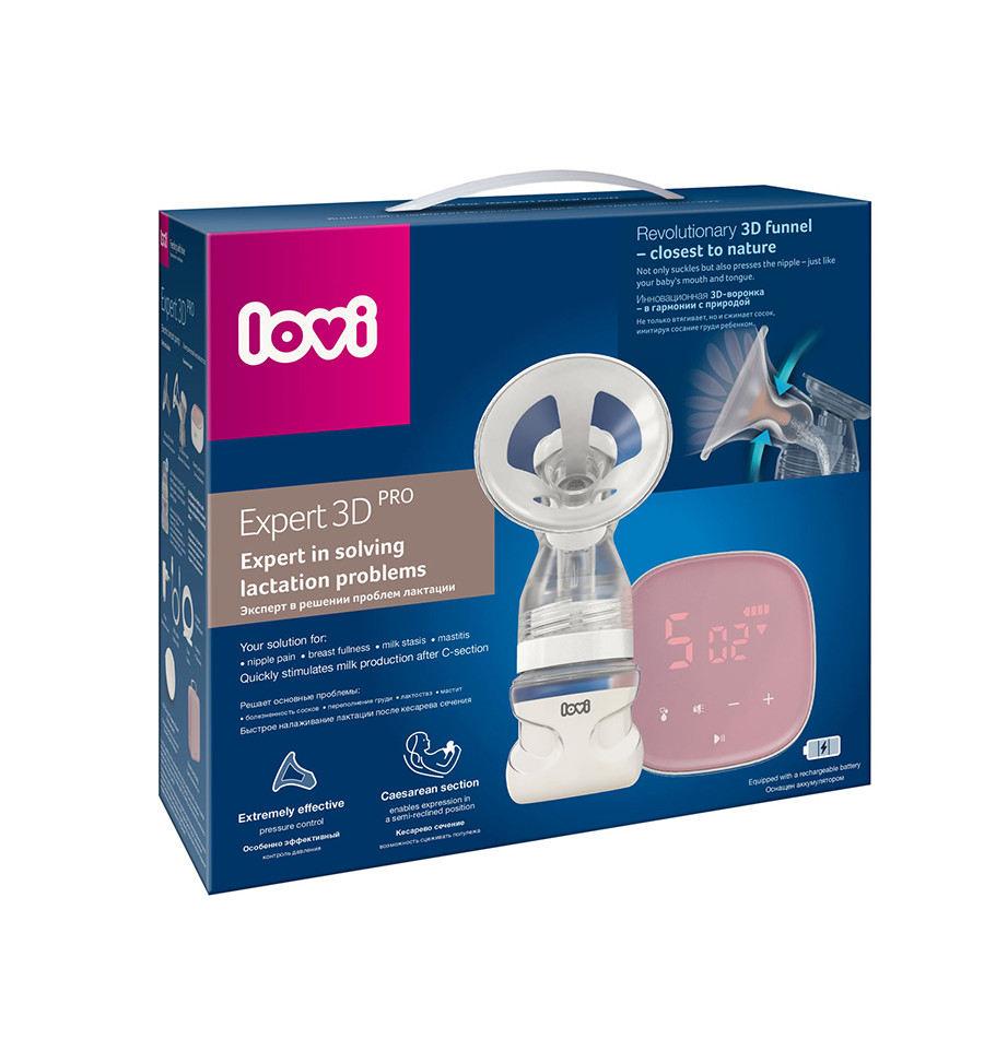 Odsávačka mlieka, Lovi Expert 3D elektrická odsávačka materského mlieka je profesionálny pomocník pri riešení problémov s laktáciou a odsávaním materského mlieka. Efektívne a jemne odsáva materské mlieko vďaka inovatívnej technológii 3D. Technologicky vyspelý silikónový nadstavec veľmi tesne objíme bradavku. Tým, že pracuje s celým svojím povrchom, napodobňuje dvojfázový proces satia dieťaťa. Je efektívna a citlivá.