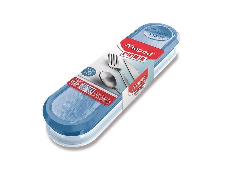 Príbor z nerezovej ocele v plastovom puzdre, obsahuje menšie lyžicu, nôž a vidličku, Možno umývať v umývačke.