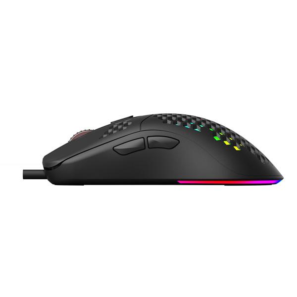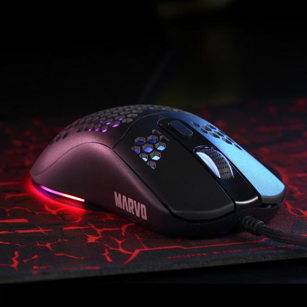 Optická herná myš Marvo G925 je ultraľahká, vďaka špeciálnemu perforovanému designu, ktorý pripomína včelí plást (Honeycomb design). Vďaka tomu váži iba 70 g a preto sa ľahko ovláda pri hre. Pri dlhodobej práci a hrách, preto nebudete pociťovať únavu. Oku bude lahodiť RGB podsvietenie myši.