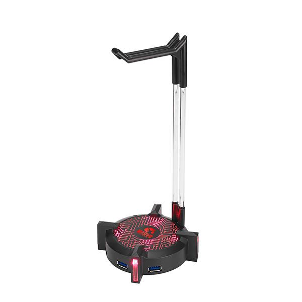 Bojujete s nedostatkom miesta na svojom stole? Stojan na slúchadlá so zabudovaným USB hubom Vám v tom pomôže. Jednak môžete skladovať svoje slúchadlá pohodlne a mať ich neustále v dosahu, a naviac ak máte v PC alebo notebooku málo USB portov, USB hub v základne stojanu je Vám k dispozícii. Stojan je univerzálny pre všetky typy náhlavných slúchadiel a spestrí Vám stôl svojim RGB podsvietením. Stabilná protišmyková základňa naviac zaistí, že bude stojan pevne držať na svojom mieste.