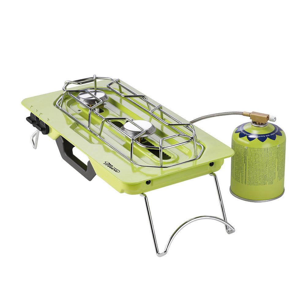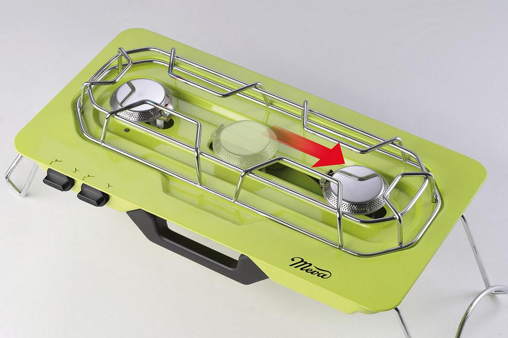 Kartušový stolný dvojvarič s variabilne posuvným horákom. Varič je vybavený piezo zapaľovaním
