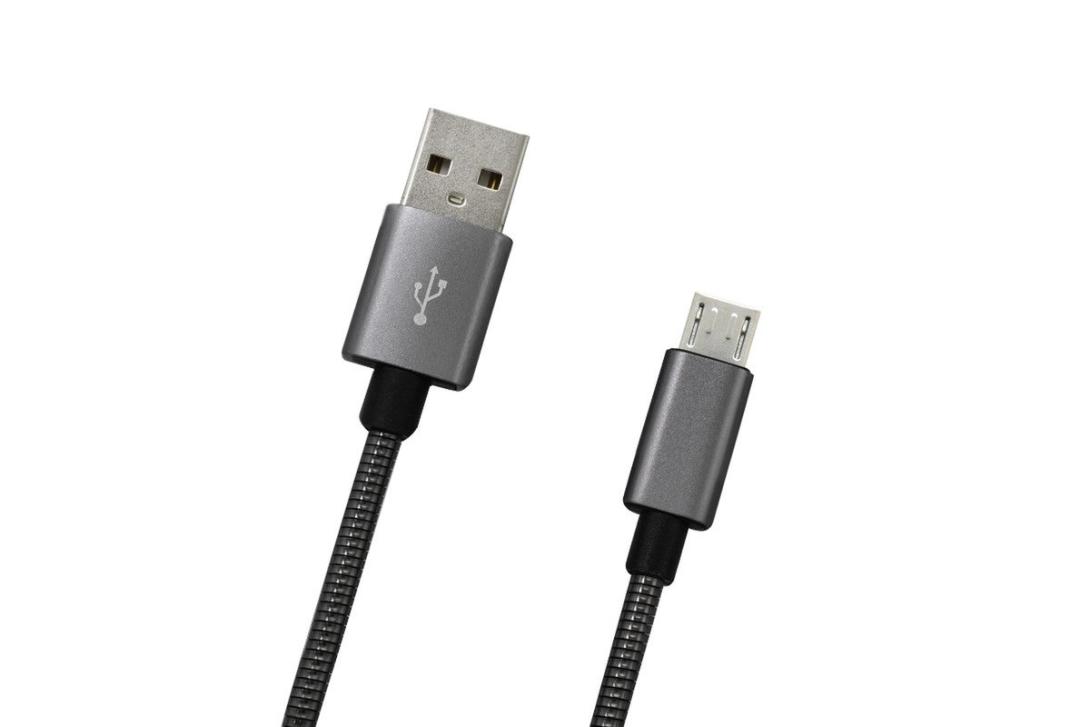 Kábel, Dostupné konektory: micro USB, USB, Farba: sivá metalíza, Kapacita: 2 A, Dĺžka 1 m, Textilné prevedenie zabraňuje vzniku uzlov a lámaniu lábla.
