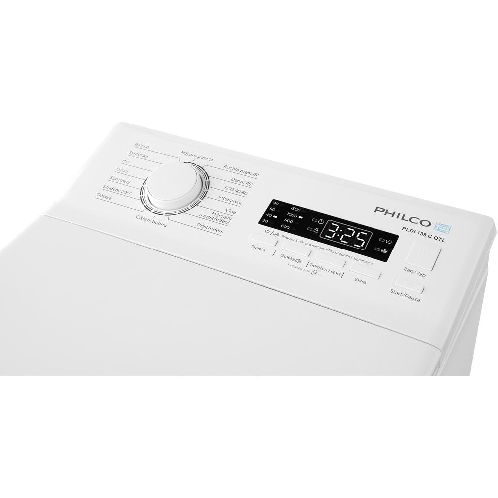 Philco PLDI 138 CQTL Vrchom plnená práčka, Maximálna náplň bielizne 8 kg, Spotreba vody 48 l / cyklus, 16 pracích programov, Hlučnosť prania / odstreďovania: 80 dB