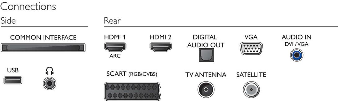- Iné pripojenia: Anténa IEC75, Konektor satelitu, Common Interface Plus (CI+), Digitálny zvukový výstup (optický), Zvukový vstup (DVI), Slúchadlový výstup, PC-vstup VGA