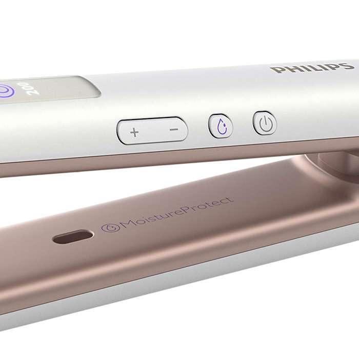 Technológia MoistureProtect kontroluje teplotu a prispôsobuje ju tak, aby oživila lesk vlasov a aby si zachovali svoju prirodzenú vlhkosť. Neustále zabezpečuje optimálnu teplotu a chráni tak vlasy pred prehrievaním. Tešte sa z krásnych vlasov, ktoré sú chránené zvnútra aj zvonka.