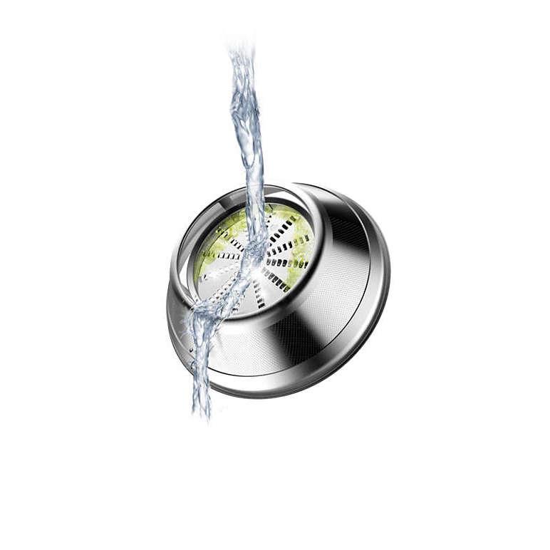 Jedinečná funkcia predčistenia Philips vám umožňuje odšťavovač medzi jednotlivými odšťavovaniami, resp. po odšťavení, rýchlo opláchnuť. Naliatím vody do zatláčacieho piestu môžete vytvoriť vodnú fontánu, ktorá zmyje nežiaduce zvyšky.