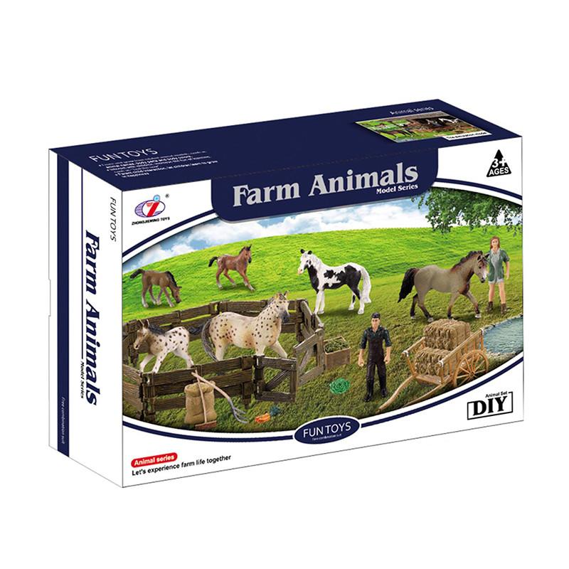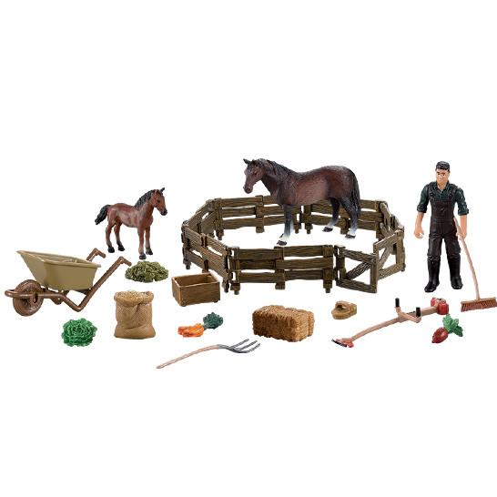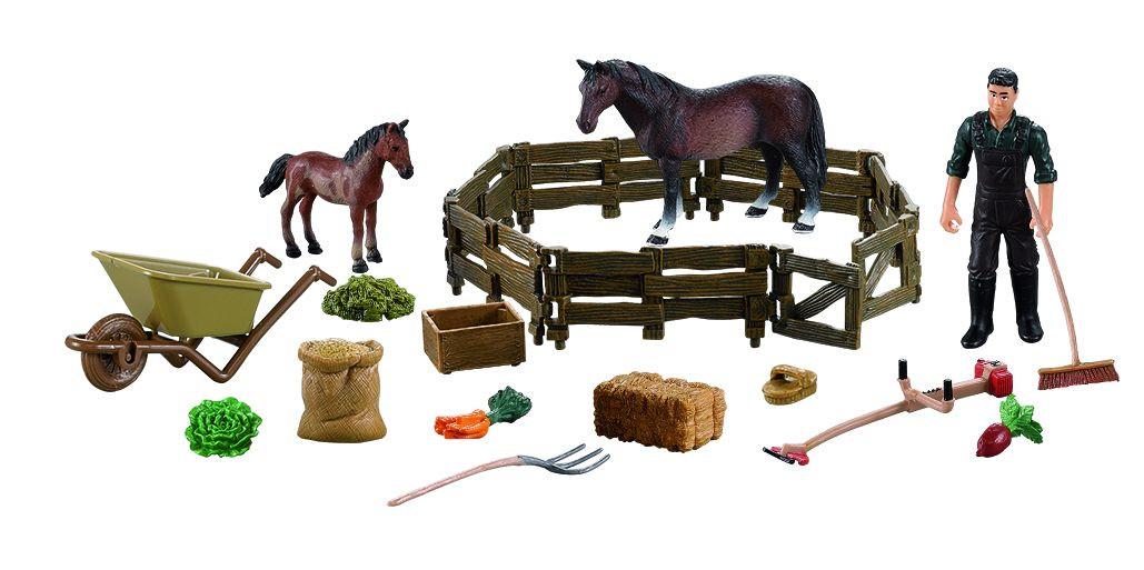 Ohrada s kobylou a žriebäťom, Sada obsahuje jednu kobylu, jedno žriebä v hnedom sfarbenie, postavičku farmára a v neposlednom rade tiež mnoho skvelého príslušenstva.
