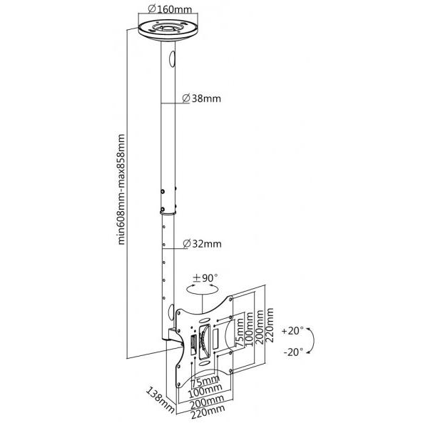 Stropný držiak, podporuje VESA (rozteč závitov): 50x50, 75x75, 100x100, 200x100, 200x200, rozsah otáčania do strán: 180 st., rozsah naklápania: +/-20 st., Max. nosnosť 30 kg
