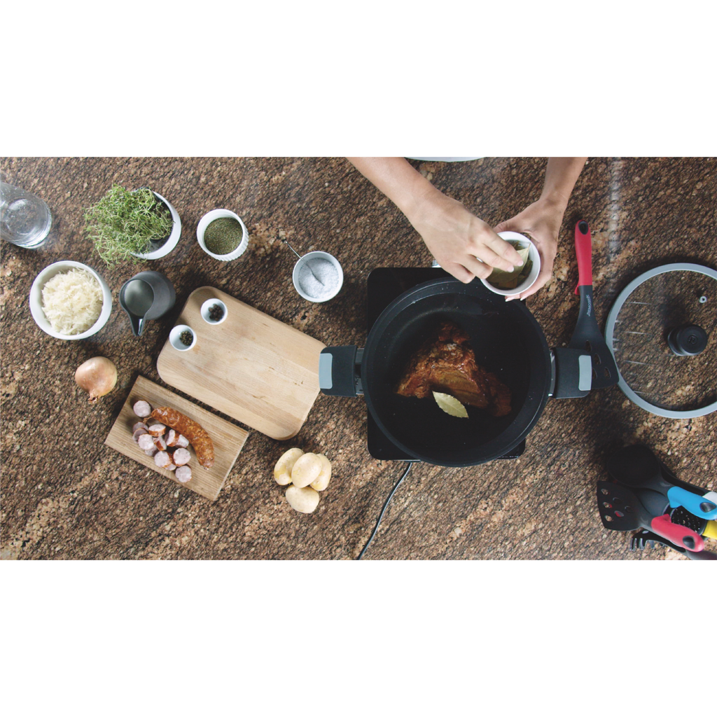 Vďaka sklenenej pokrievke sa vaša Tria zmení na veľký 4,5-litrový hrniec vhodný na všetky typy sporákov vrátane indukcie, v ktorom môžete variť pre celú rodinu. Hrniec je vyrobený z hliníka s priemerom 28 cm a hrúbkou dna 4,5 mm. Na zabezpečenie dlhej životnosti a nepriľnavosti má hrniec trojvrstvový nepriľnavý povrch vystužený čiastočkami oxidu titánu.