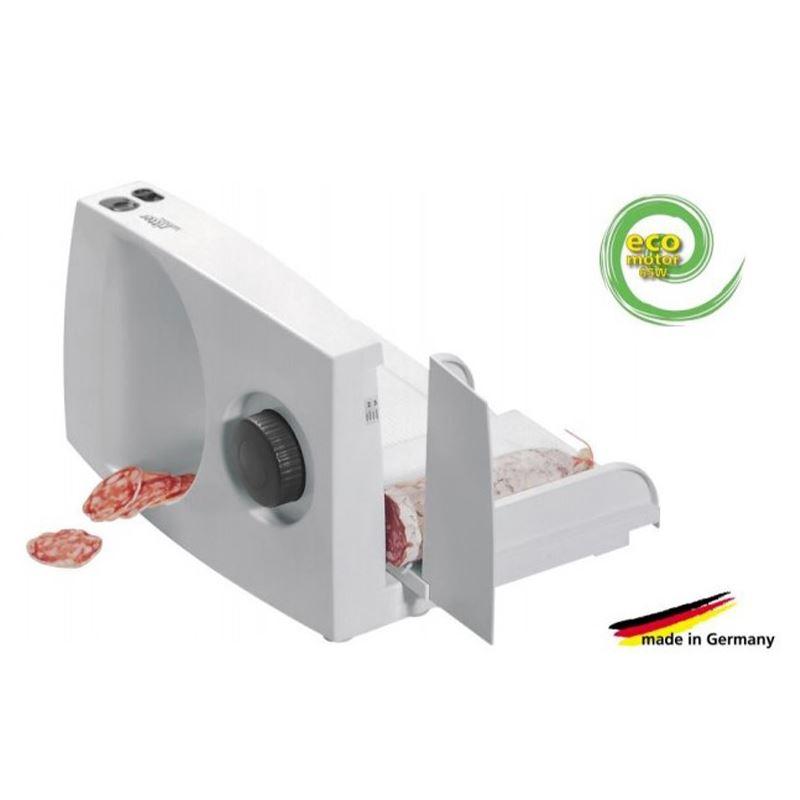 Krájač potravín, Vysokokvalitný plast, Zúbkovaný nôž s priemerom 17 cm, Hrúbka rezu nastaviteľná do cca 14 mm, Bezpečnostný spínač na prerušovanú a nepretržitú prevádzku