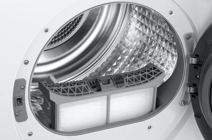 Sušička, Spotreba el. energie 194 kWh / cyklus, Hlučnost 63 dB, Praktický filter 2 v 1