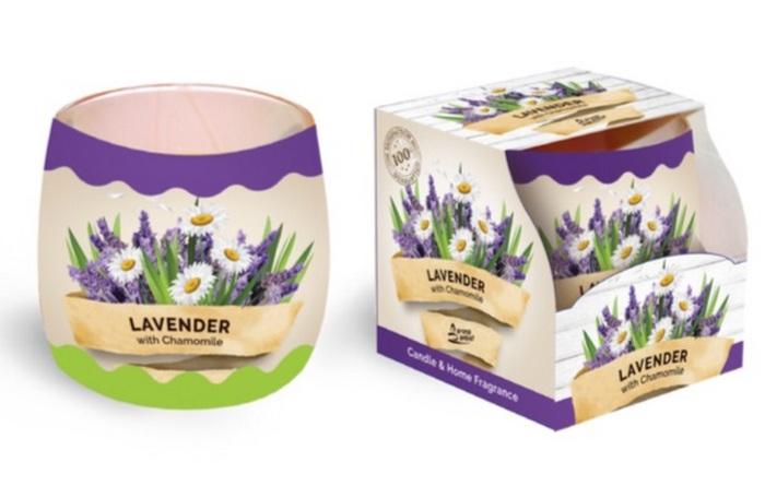 Vonná sviečka, Vonná sviečka v skle s príjemnou vôňou levandule.