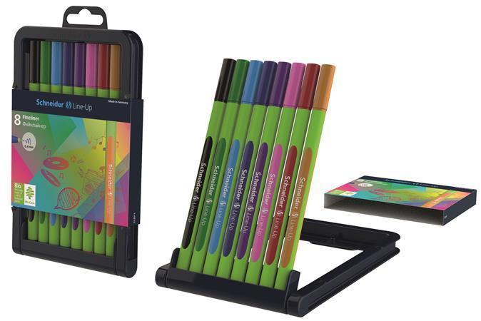 tenké a presné písmo plynulé písmo vďaka nehrdzavejúcemu hrotu atrament na báze vody zelené plastové telo telo v 88% z plastu s BIO základom gumované, trojuholníkové telo pera koniec pera sa zhoduje s farbou atramentu hrúbka písma: 0,4 mm 30 rôznych farieb astaviteľný držiak na linery vyrobený z recyklovaného plastu sada obsahuje 8 linerov v rôznych farbách.
