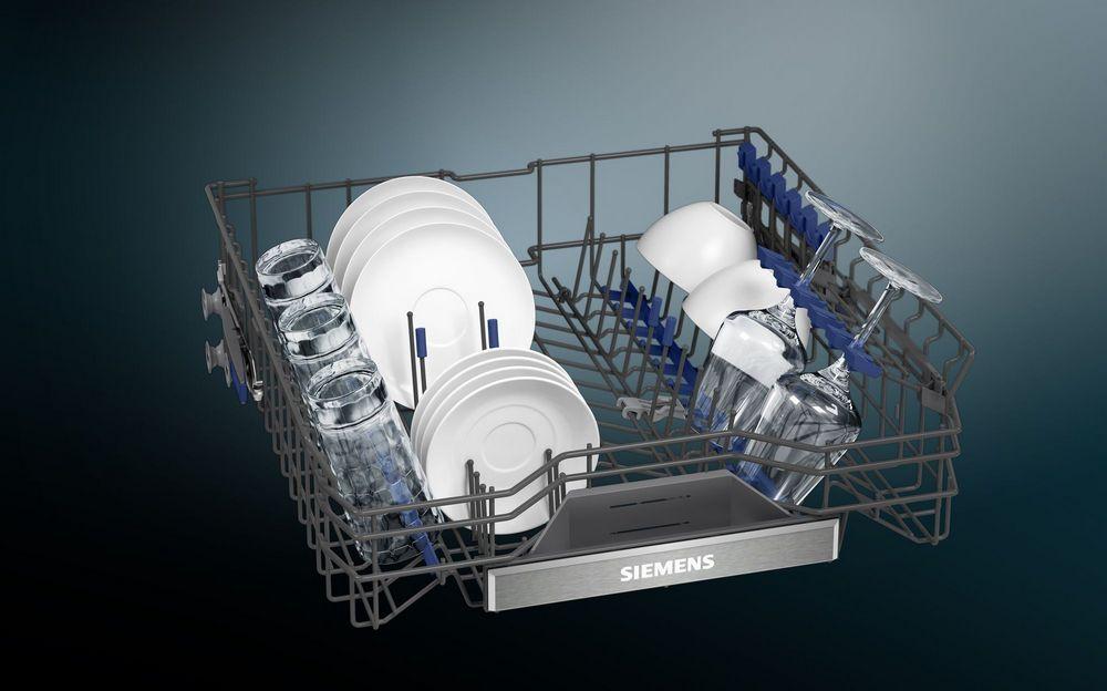 Prémiová konštrukcia umývačiek riadu Siemens nie je viditeľná len zvonku. Modro označené uchopovacie časti vnútri umývačky vám na prvý pohľad ukazujú všetky možnosti nastavenia košov. Veľké hrnce tak môžu byť uložené rýchlejšie. Poháre na víno a šampanské sú výrazne stabilnejšie.