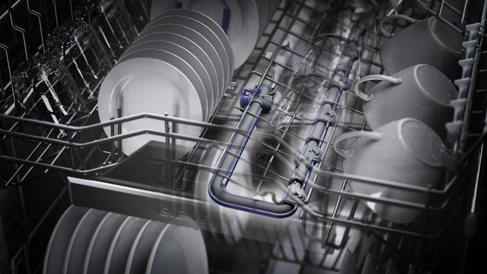 Prémiová konštrukcia umývačiek riadu Siemens nie je viditeľná len zvonku. Modro označené uchopovacie časti vnútri umývačky vám na prvý pohľad ukazujú všetky možnosti nastavenia košov. Veľké hrnce tak môžu byť uložené rýchlejšie. Poháre na víno a šampanské sú výrazne stabilnejšie.