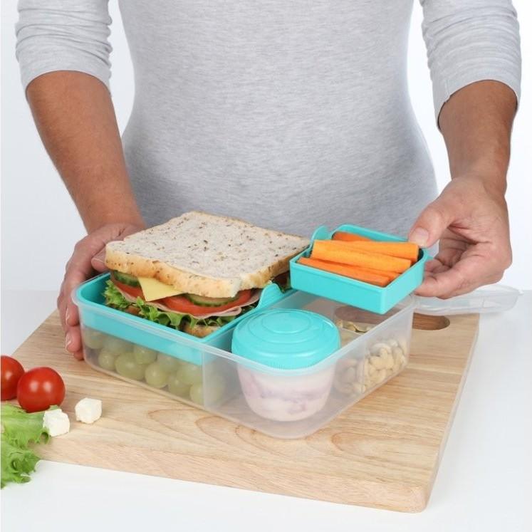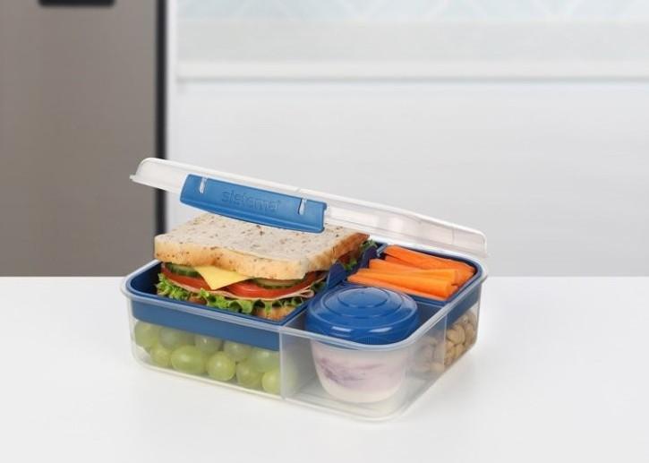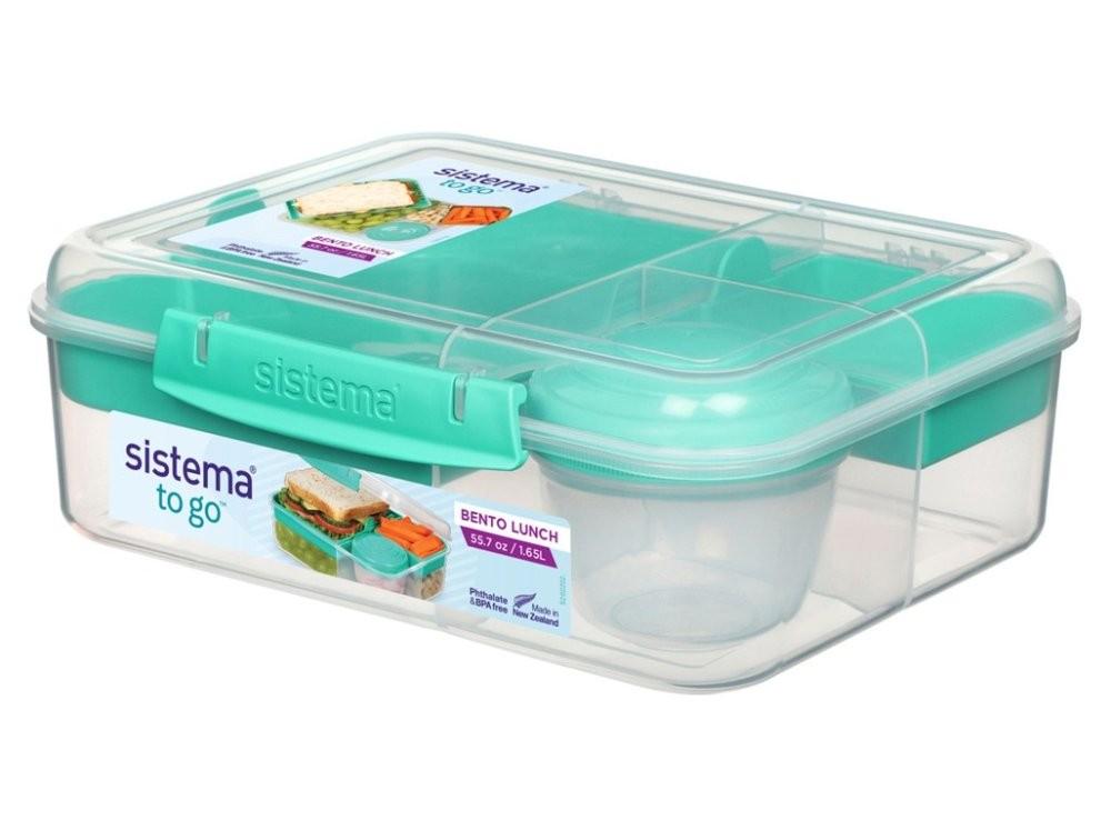 Sistema® TO GO™ Trojkomorová krabička s nádobou na jogurt a 2 tácky 1,65 l sa skladá z troch komôr, ktoré vám umožnia oddeliť rôzne druhy potravín.