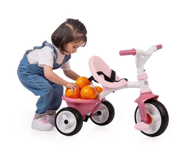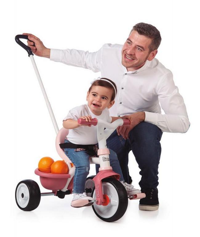 Trojkolka, Šliapacia trojkolka pre dievčatká v ružovej farbe má kovový rám, nastaviteľnú a odnímateľnú vodiacu tyč (3 výškové úrovne, max. 95 cm), protišmykové pedále s možnosťou zablokovania šliapania, nastaviteľné ergonomické sedadlo na 2 pozície, bezpečnostný pás, výklopný plastový košík a tiché kolieska. Rozmery: 68 x 52 x 52 cm.