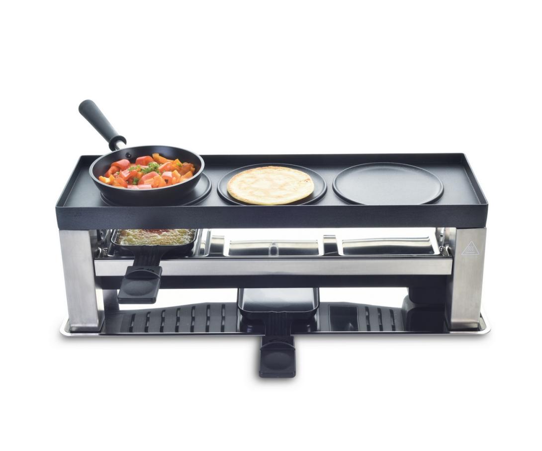 - Kombinácia stolného grilu, raclette, mini wok a mini palaciniek v jednom zábavnom prístroji.