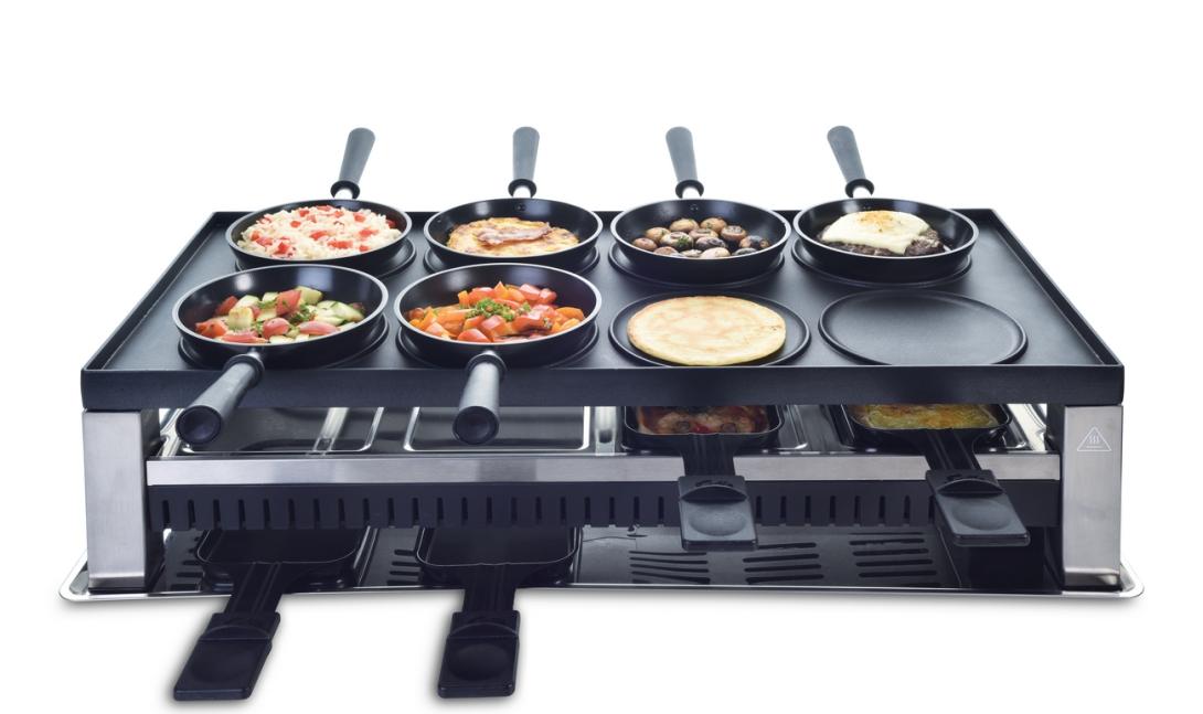 - Súčasťou balenia: 8x raclette panvička s nepriľnavým povrchom, 8x špachtľa, 8x mini wok panvička s nepriľnavým povrchom