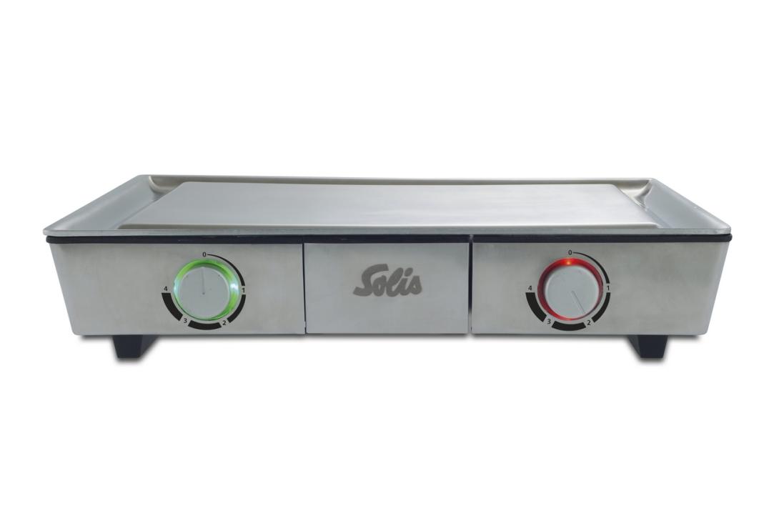 Grilujte mäso a hneď vedľa pripravujte zeleninu na pare. Na veľkej grilovacej doske, ktorú je možné rozdeliť na dve nezávislé polovice s oddelenými ovládačmi, pripravíte pokrm pre niekoľko ľudí súčasne. Regulátory teploty sú vybavené svetelným indikátorom (červený = ohrieva sa / zelený = pripravený). Povrch z nerezovej ocele má mnoho výhod: ohrieva sa veľmi rýchlo až do 230 °C, jedlo sa griluje len krátko – takže sú zachované živiny a vitamíny, krájanie a otáčanie s lopatkami nie je problém, pretože sa nič nepoškriabe. Varenie pri stole je zábavné a hostiteľ nemusí obetovať hodiny prípravám mäsa. Víťazná situácia pre každého.