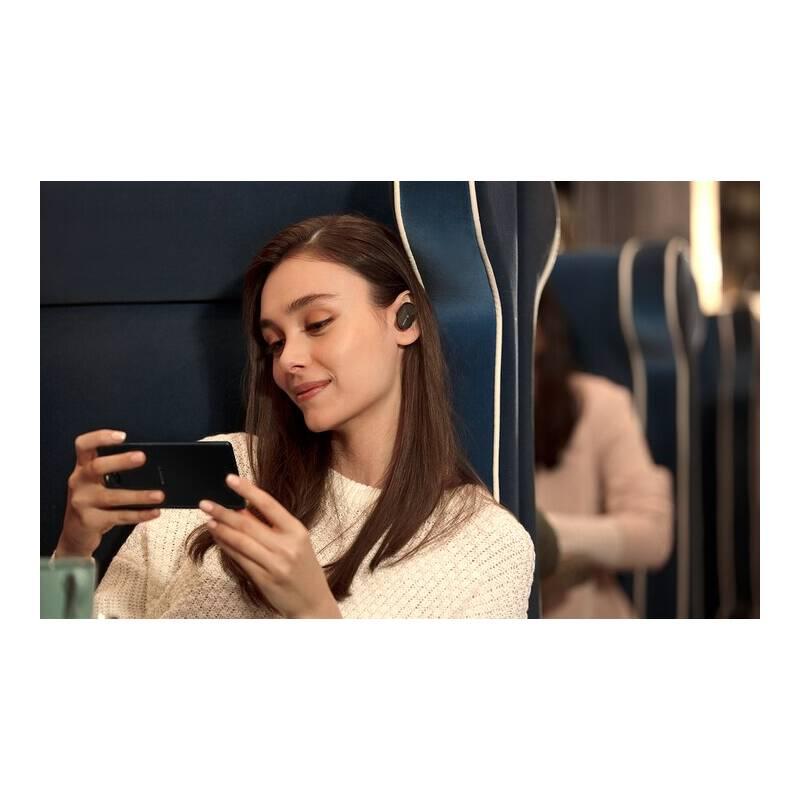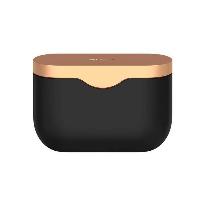 - Bezdrôtové (tzv. True wireless), uzavreté, dynamické slúchadlá do uší Sony s funkciou aktívneho potlačenia okolitého hluku (ANC), matná čierna farba so zlatými prvkami.