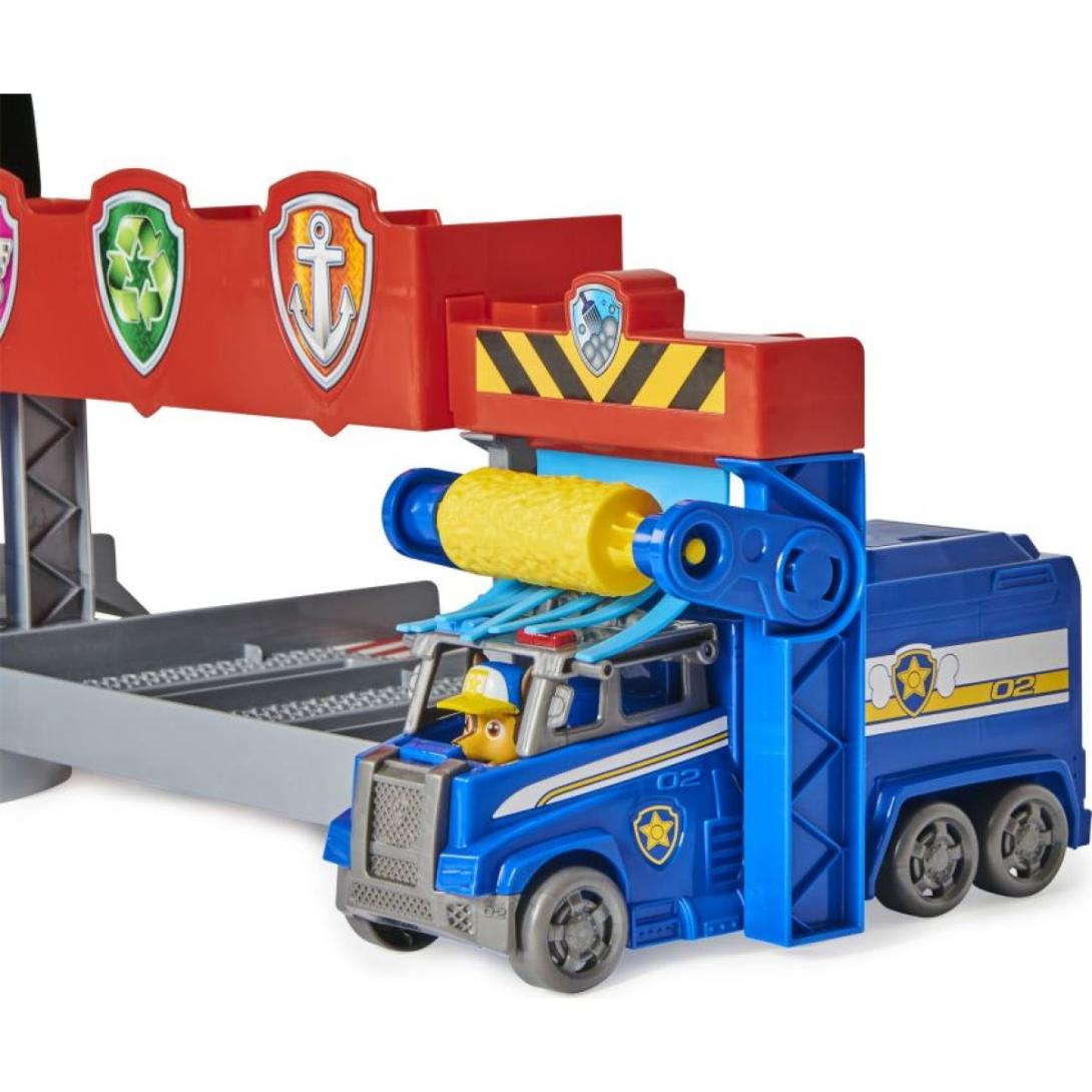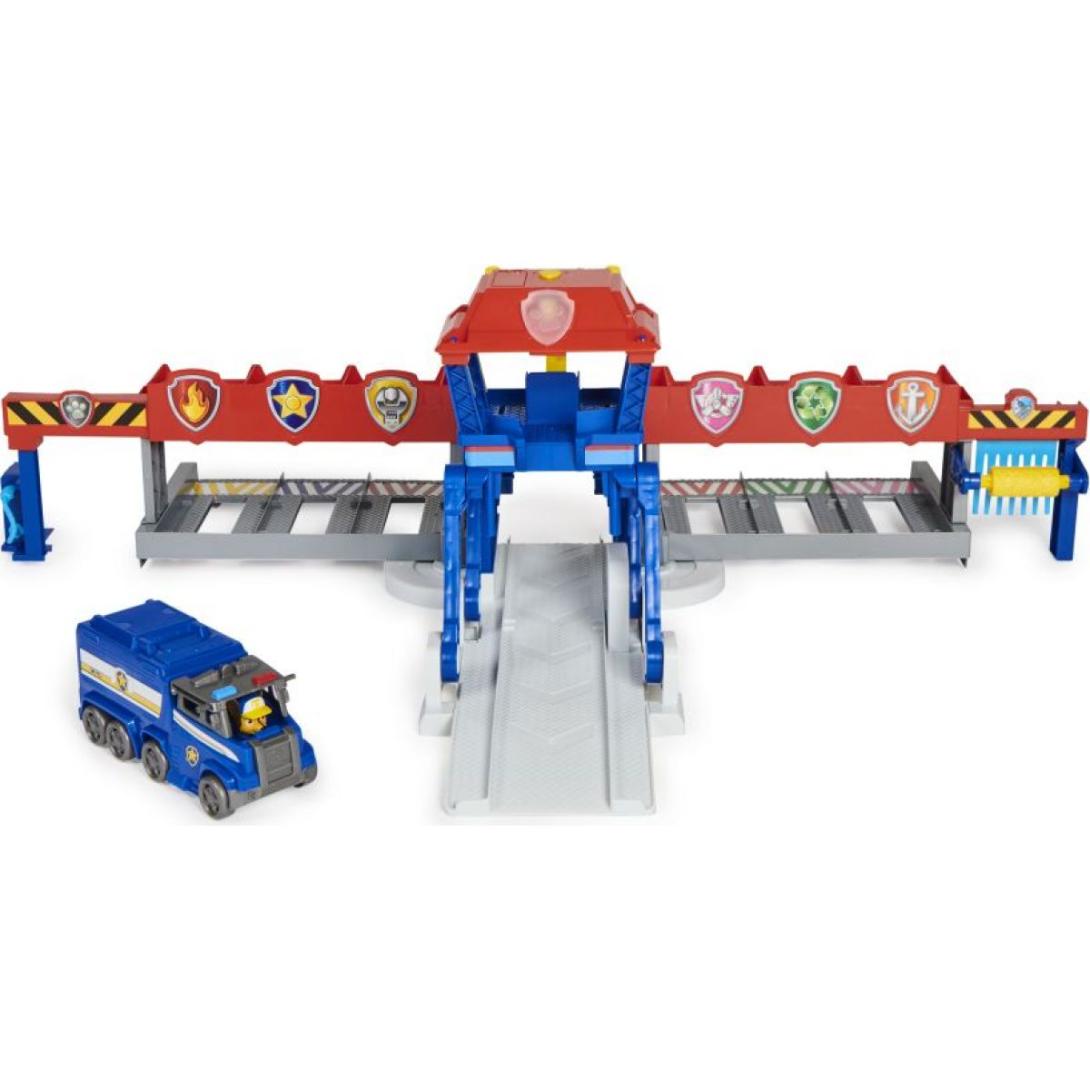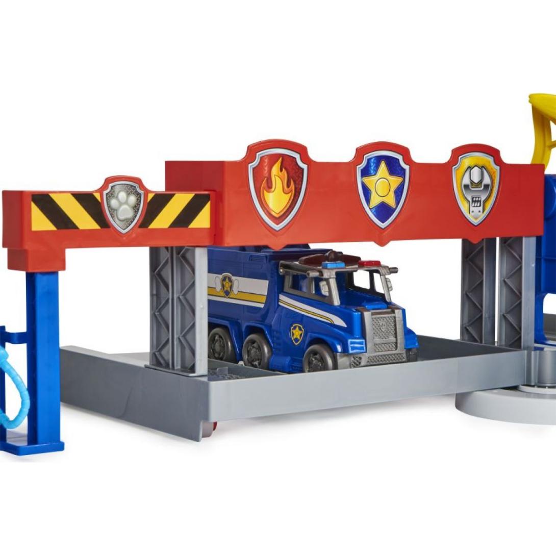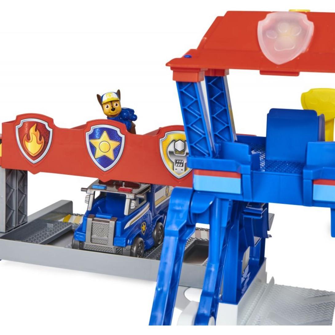 Parádna priestranná garáž pre trucky psích záchranárov, ktorú si môžu deti transformovať z centrálnej veže.