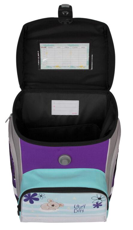 - VNÚTORNÉ USPORIADANIE - Hlavná vnútorná komora je rozdelená látkovou prepážkou pre lepšie uloženie pomôcok. V prednej časti komory je vrecko na uloženie drobností. Predné vrecko aktovky je určené pre desiatový box alebo peračník.