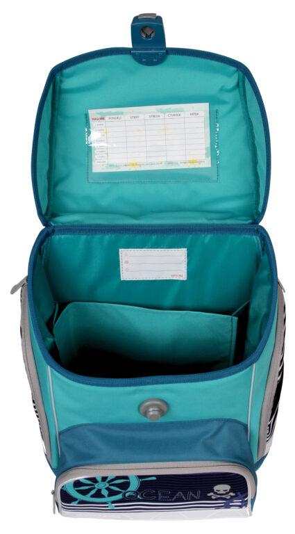 - VNÚTORNÉ USPORIADANIE - Hlavná vnútorná komora je rozdelená látkovou prepážkou pre lepšie uloženie pomôcok. V prednej časti komory je vrecko na uloženie drobností. Predné vrecko aktovky je určené pre desiatový box alebo peračník.