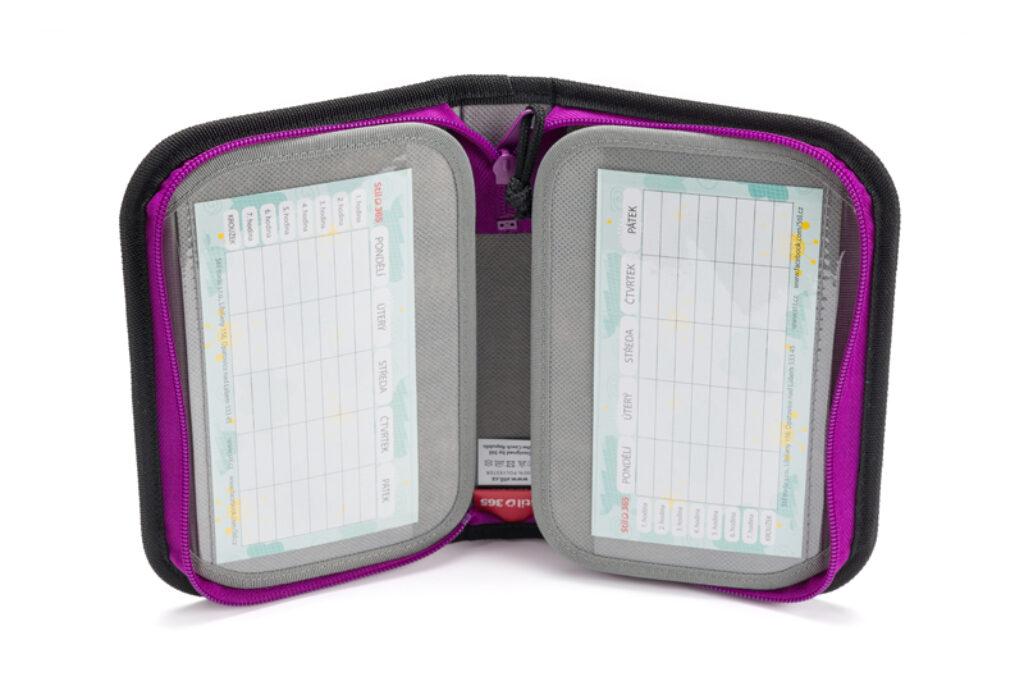 • Dve vnútorné klopy majú na vonkajšej strane priehľadné vrecko na rozvrh alebo iné malé dokumenty.