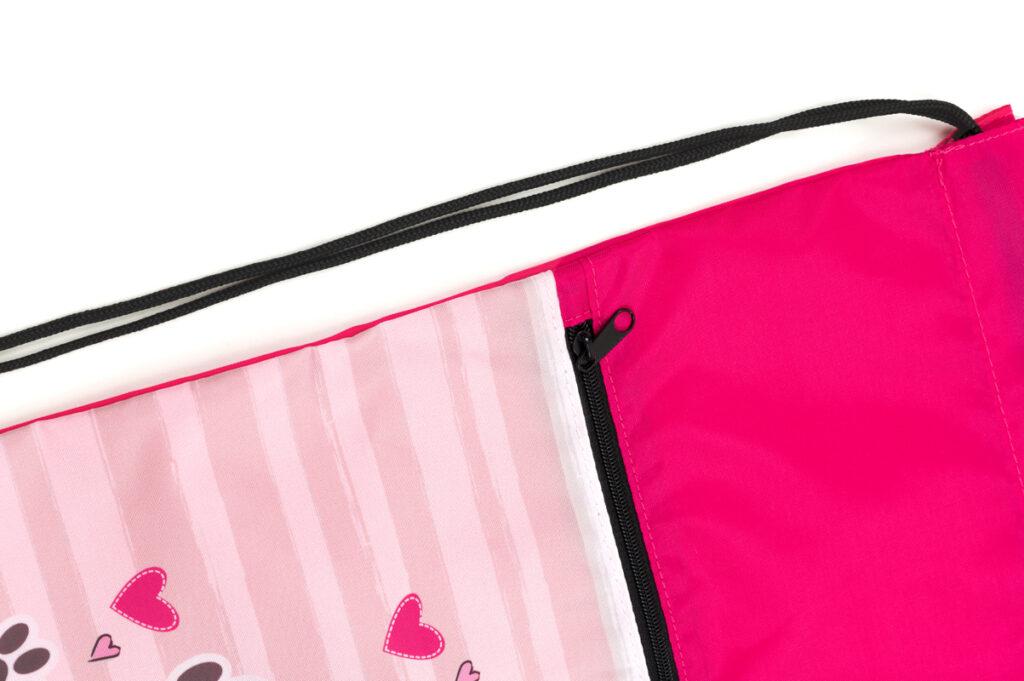 Zaťahovacia šnúrka spojená so spodnou časťou premení vrecko na malý batôžtek na chrbát.