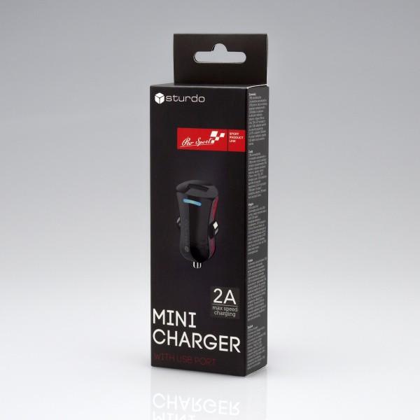Univerzálna USB autonabíjačka Sturdo dizajnovej rady Pro Sport. Elegantné čierne prevedenie. Pre pohodlné nabíjanie smartfónov, tabletov, navigácií počas jazdy. Malý kompaktný rozmer (najmenší vo svojej triede) zaručí pohodlné uloženie do odkladacích priečinkov automobilu. Výrazná modrá LED dióda poskytuje spoľahlivú informáciu o nabíjaní zariadenia.