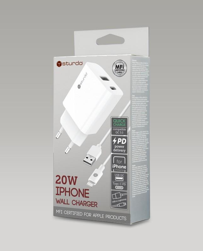 Biela Sturdo 3A PD 20W+USB QC3.0 MFi kábel sieť.