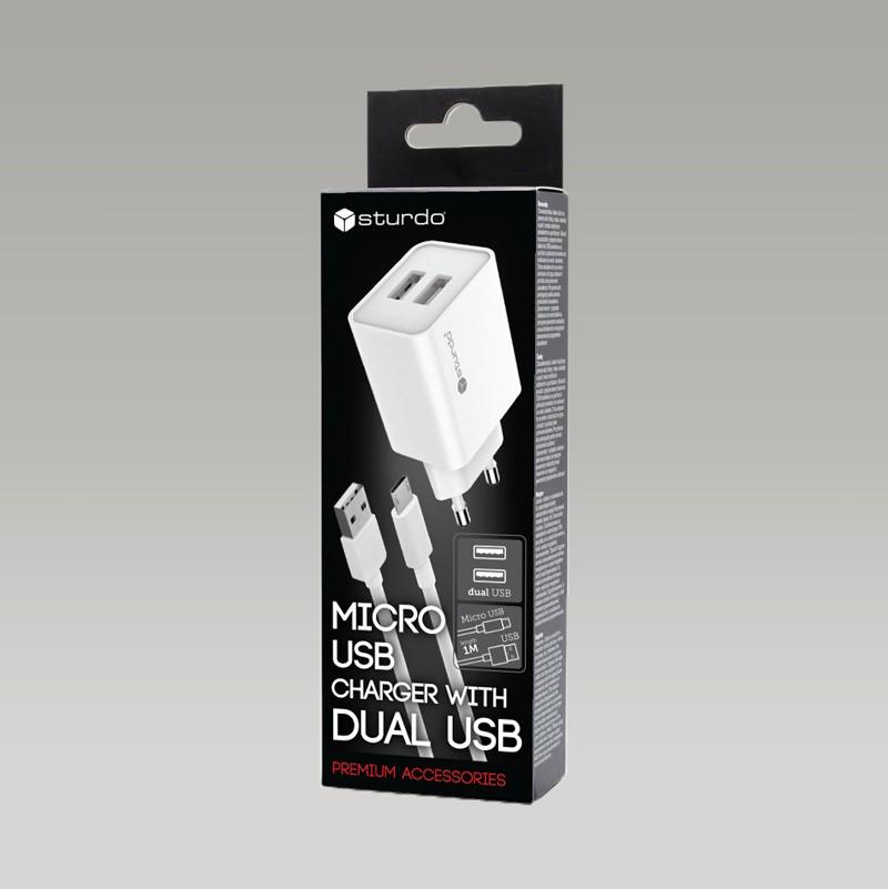 Nabíjačka, Sturdo sieťová nabíjačka 2,1A 2xUSB + Micro USB kábel, Biely