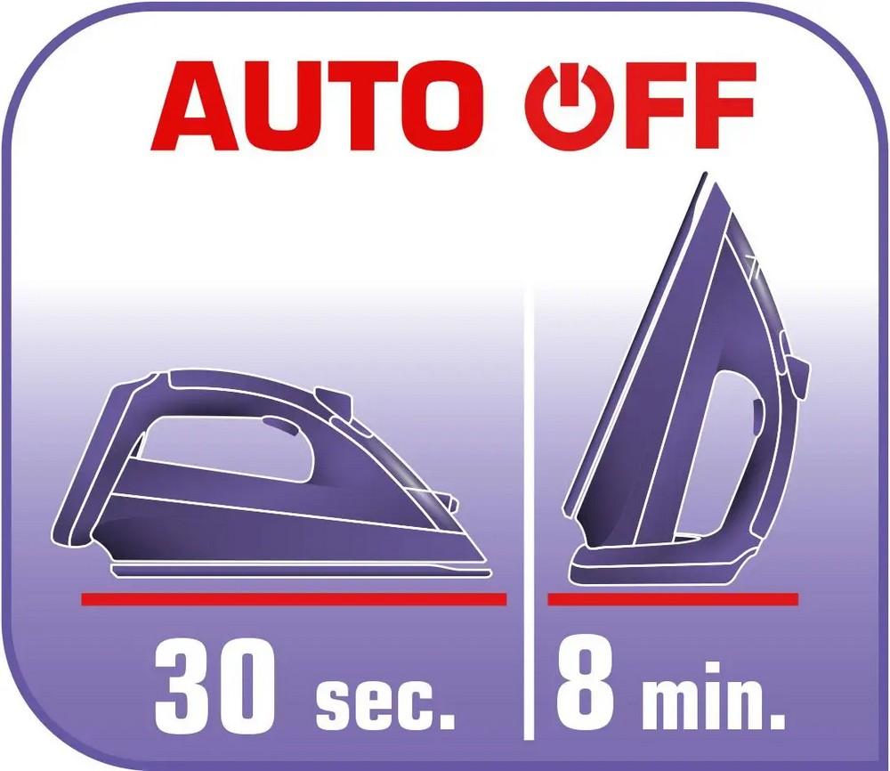 Ak je žehlička náhodou ponechaná bez dozoru, automaticky sa vypne. Vo vertikálnej polohe sa vypne o 8 minút. Ak žehlička zostane stáť na žehliacej ploche, trvá jej vypnutie len 30 sekúnd.