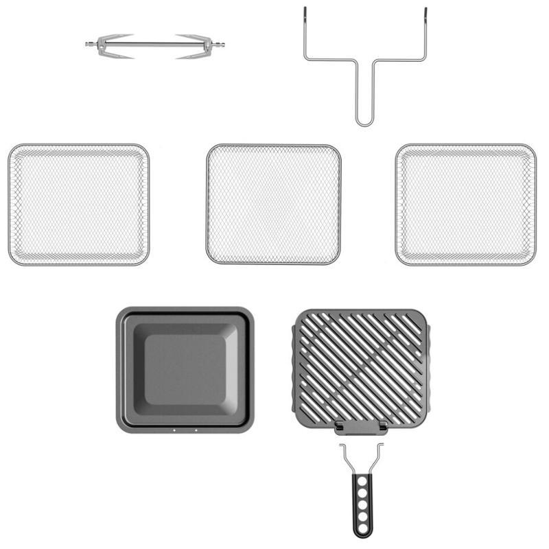 7 častí príslušenstva zaručuje univerzálne použitie a prípravu rôznorodých receptov: 2 mriežky, fritovací kôš, podnos na odkvapkávanie, rošt na kurčatá, mriežka s rukoväťou a podstavec na grilovanie s odnímateľnou rukoväťou