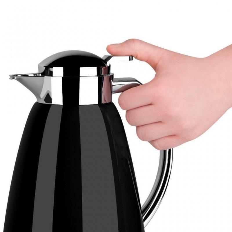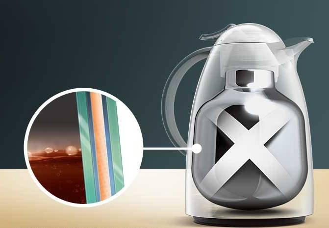 Vákuová termokanvica so sklenenou vnútornou nádobou, objem: 1 l, 100% tesniaca, 100% hermeticky uzatvorená, 5-vrstvová izolácia: 2 vrstvy skla, 2 vrstvy strieborného povlaku a vákuum