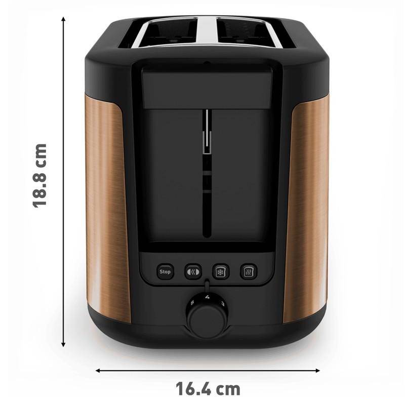 Tento elegantný hriankovač s povrchovou úpravou z nehrdzavejúcej ocele Coppertinto prinesie do každej kuchyne štýlový nádych. Ponúka extra široké otvory s automatickým centrovaním, vstavanú mriežku na žemle a sedem úrovní opekania, vďaka čomu pripravíte hrianky presne podľa svojej chuti. Praktické funkcie ako rozmrazovanie, ohrievanie či režim pre bagety zabezpečia maximálnu všestrannosť. Vďaka tlačidlu na prerušenie cyklu, extra vysokému zdvihu páčky a vyberateľnej tácke na omrvinky je obsluha aj údržba veľmi jednoduchá a pohodlná.