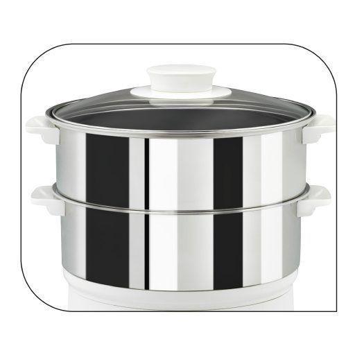 Praktický parný hrniec, vďaka ktorému využijete všetky výhody varenia v pare a budete pripravovať jednoducho vynikajúce pokrmy. Dve stohovateľné nádoby pre praktické skladovanie. Vďaka 60-minútovému časovaču s automatickým vypnutím a možnosťou sledovania hladiny vody a plnenia počas varenia sa veľmi ľahko používa. Nádoby v prevedení z odolnej antikorovej ocele.
