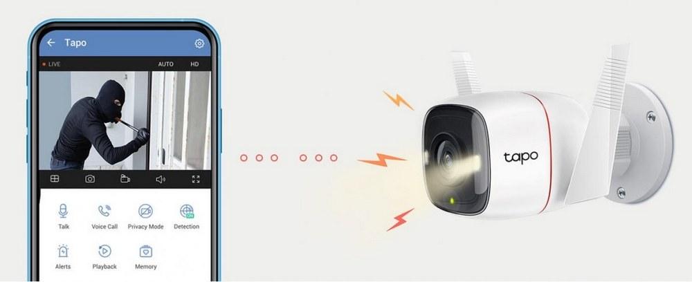 Kamera disponuje obojsmernou hlasovou komunikáciou a vďaka aplikácii Tapo možno sledovať dianie v okolí 24 hodín denne 7 dní v týždni odkiaľkoľvek cez váš smartphone alebo zariadenia podporujúce hlasových asistentov Amazon Alexa alebo Google Assistant. Aplikácia automaticky odosiela upozornenie pri detekcii pohybu či zvuku.