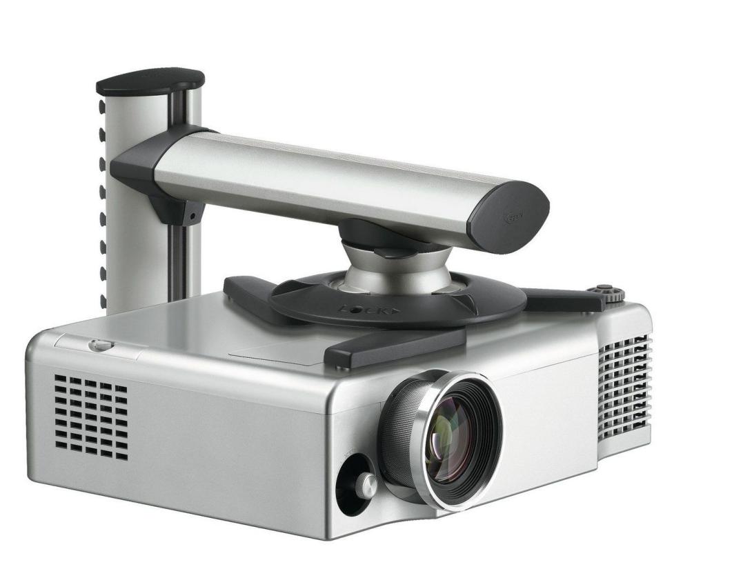 Nástenný držiak na menší projektor Univerzálny držiak umožní bezpečne namontovať na stenu ľubovolný menší projektor do 10 kg. Projektor môžeme namontovať štandartne, aleboo hore nohami v ľubovoľnej výške. Vďaka nastavitelnému ramenu môžeme meniť vzdialenosť uchytenia od steny, vyhovuje teda projektorom rôzných veľkostí. Unikátny guľový kĺb poskytuje široký rozsah jednoduchého nastavenia požadovaného smeru, to je vďaka následnej aretácii veľmi stabilné. Ak projektor nepoužívame, môžeme ho spolu s vodorovným ramenom jednoducho bez použitia náradia zložiť.