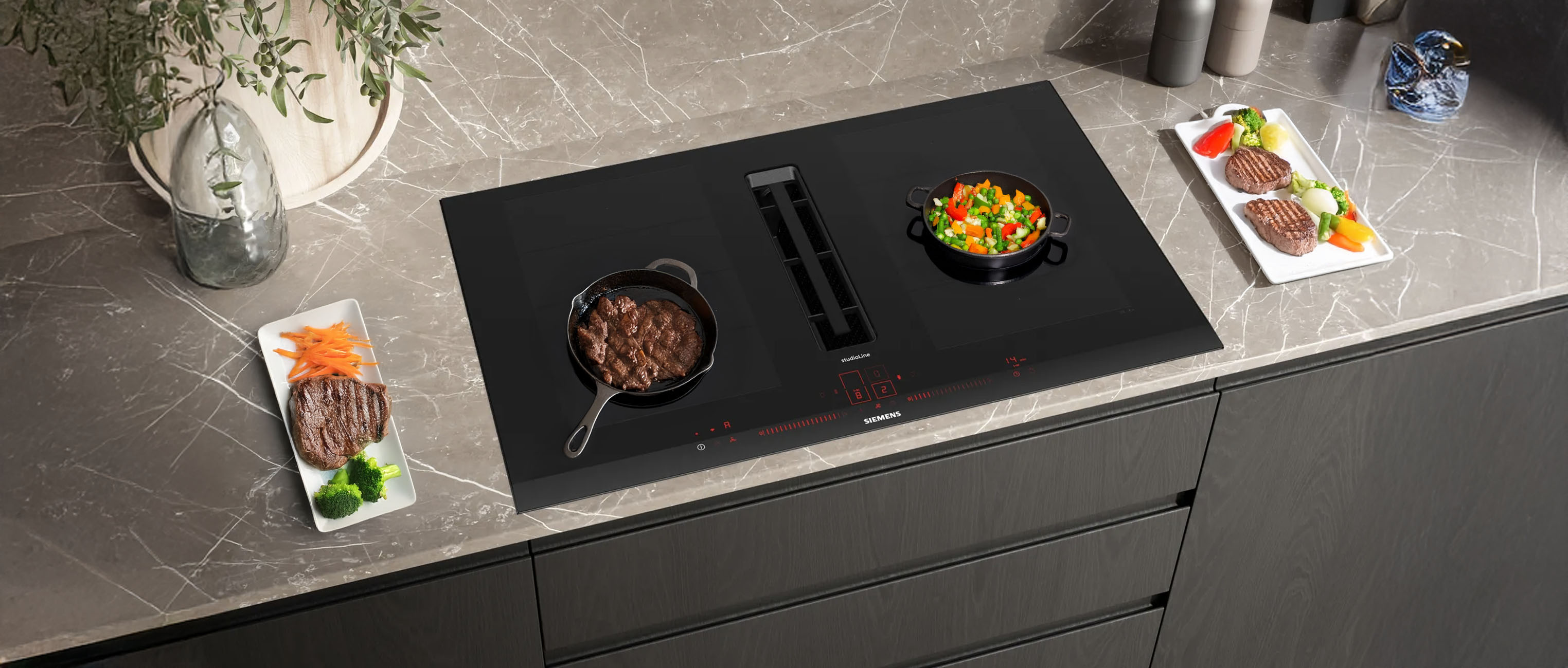 Ďalšou skvelou alternatívou je indukčná varná doska Siemens inductionAir, ktorá vyniká flexibilitou a vysokým výkonom. Vďaka funkcii flexInduction sa varná plocha automaticky prispôsobí veľkosti a tvaru riadu – dokonca aj pri použití veľkých platní ako gril či teppanyaki. Pokiaľ potrebujete intuitívne a rýchle ovládanie, Siemens ponúka inovatívne ovládanie Dual lightSlider, ktoré reaguje na jemný dotyk a po vypnutí zmizne, čo zanecháva len hladký čierny povrch bez zbytočných tlačidiel.