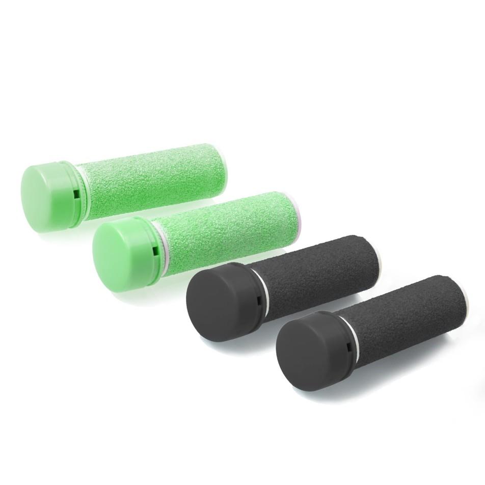 Pedi brúska na päty, Ergonomicky tvarovaná rukoväť, 4 výmenné rotačné hlavy (2 hrúbky) + 1 čistiaca kefka, Rotačné hlavy možno ľahko odňať a umyť