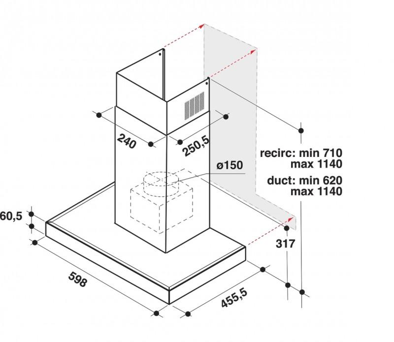 Komínový digestor, Príkon 1 motora 270 W, Minimálna hladina hluku 38 dB(A) re 1 pW, Maximálna hladina hluku 72 dB(A) re 1 pW, Min. vzdialenosť od elektrickej varnej dosky 500 mm, Min. vzdialenosť od plynovej varnej dosky 650 m, Priemer príruby odsávacej rúry 150 mm